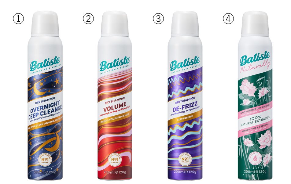 ①バティスト ドライシャンプー オーバーナイト(ドリーミージャスミンの香り)・・・寝起きのニオイやベタつきが気になる方に